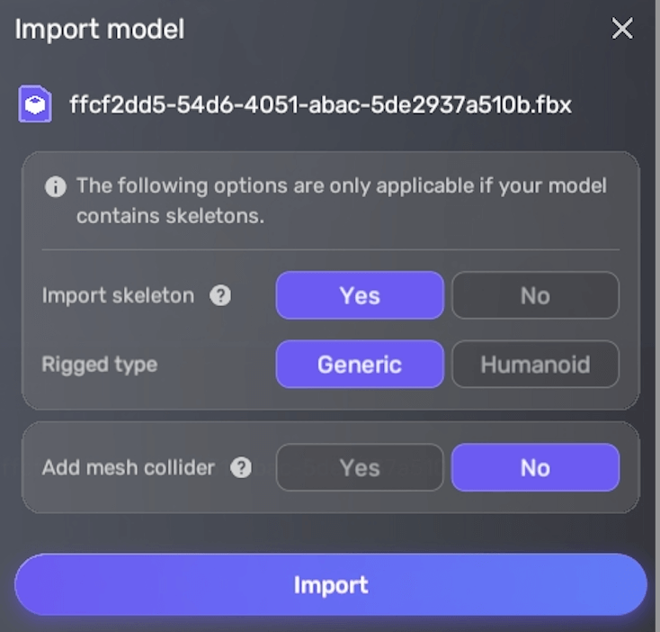 属性 说明 导入骨骼 是否导入用于动画的骨骼数据。若模型包含骨骼,设为 是;设为 否时仅导入网格、材质和纹理。根据模型实际情况选择。 骨骼类型 选择为 3D 模型添加骨骼或结构的方法以实现动画。Generic 适用于基础动作和动画的简单骨骼结构,Humanoid 适用于高级控制的复杂骨骼。仅在“导入骨骼”设为“是”时显示 ,根据模型骨骼类型选择。 添加网格碰撞体 是否自动添加网格碰撞体。大量网格碰撞体可能影响性能,建议在 Studio 内使用基础碰撞体(如盒、球或胶囊)。注意:带动画和骨骼的 FBX 文件经第三方蒙皮网格渲染器处理后,导入时会生成胶囊碰撞体。 -